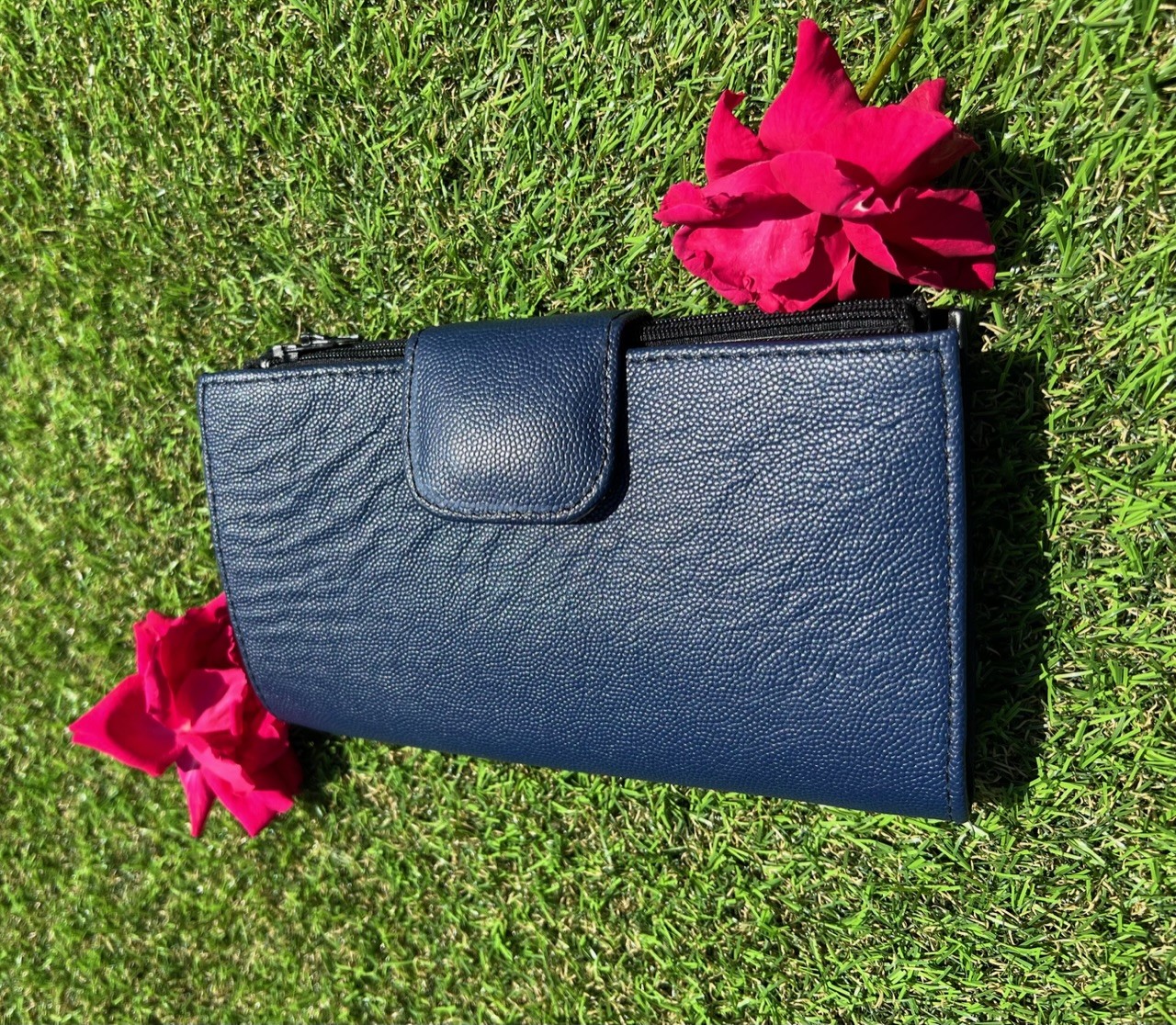 Il est en cuir grainé de couleur bleu marine et noir , fermeture par bouton a pression.